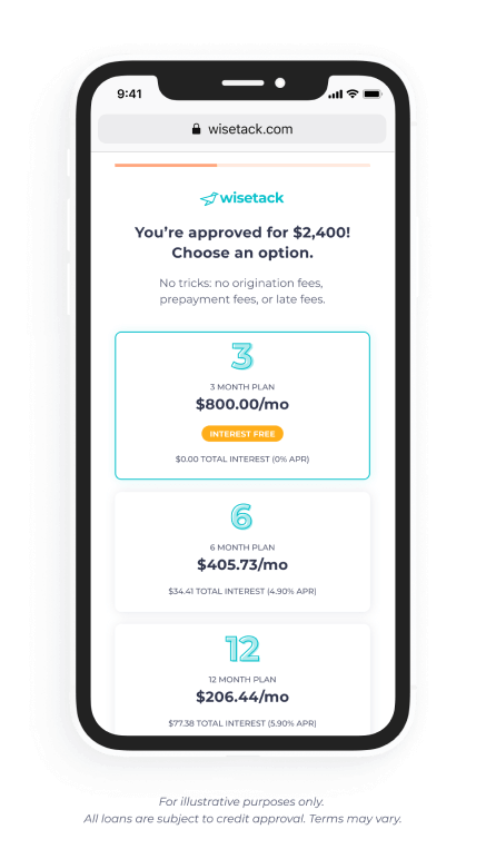 *All financing is subject to credit approval. Your terms may vary. Payment options through Wisetack are provided by our lending partners. For example, a $1,200 purchase could cost $104.89 a month for 12 months, based on an 8.9% APR, or $400 a month for 3 months, based on a 0% APR. Offers range from 0-35.9% APR based on creditworthiness. No other financing charges or participation fees. See additional terms at https://wisetack.com/faqs.